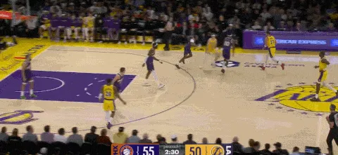 里夫斯和艾頓在弧頂掩護發(fā)起,定下伊戈達羅始終保持contain的基調方式控制著(zhù)里夫斯的突破,對位人則守住里夫斯的復盤(pán)防守右手側,這樣里夫斯就只能用繞過(guò)的太陽(yáng)團隊擊地方式傳球,被身后的湖人古德溫干擾成功造成失誤。