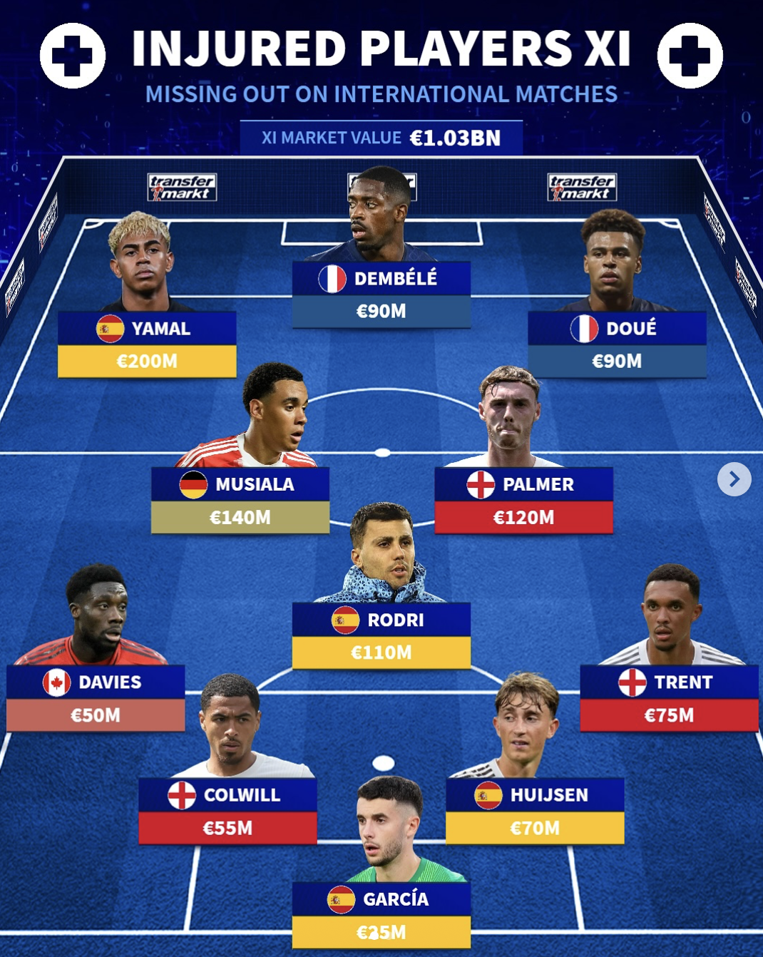 虎撲10月09日訊 德轉公布了因傷病錯過(guò)本次國家隊比賽日身價(jià)最高的十一人。西班牙的板因本次亞馬爾以2億歐身價(jià)領(lǐng)銜陣容: