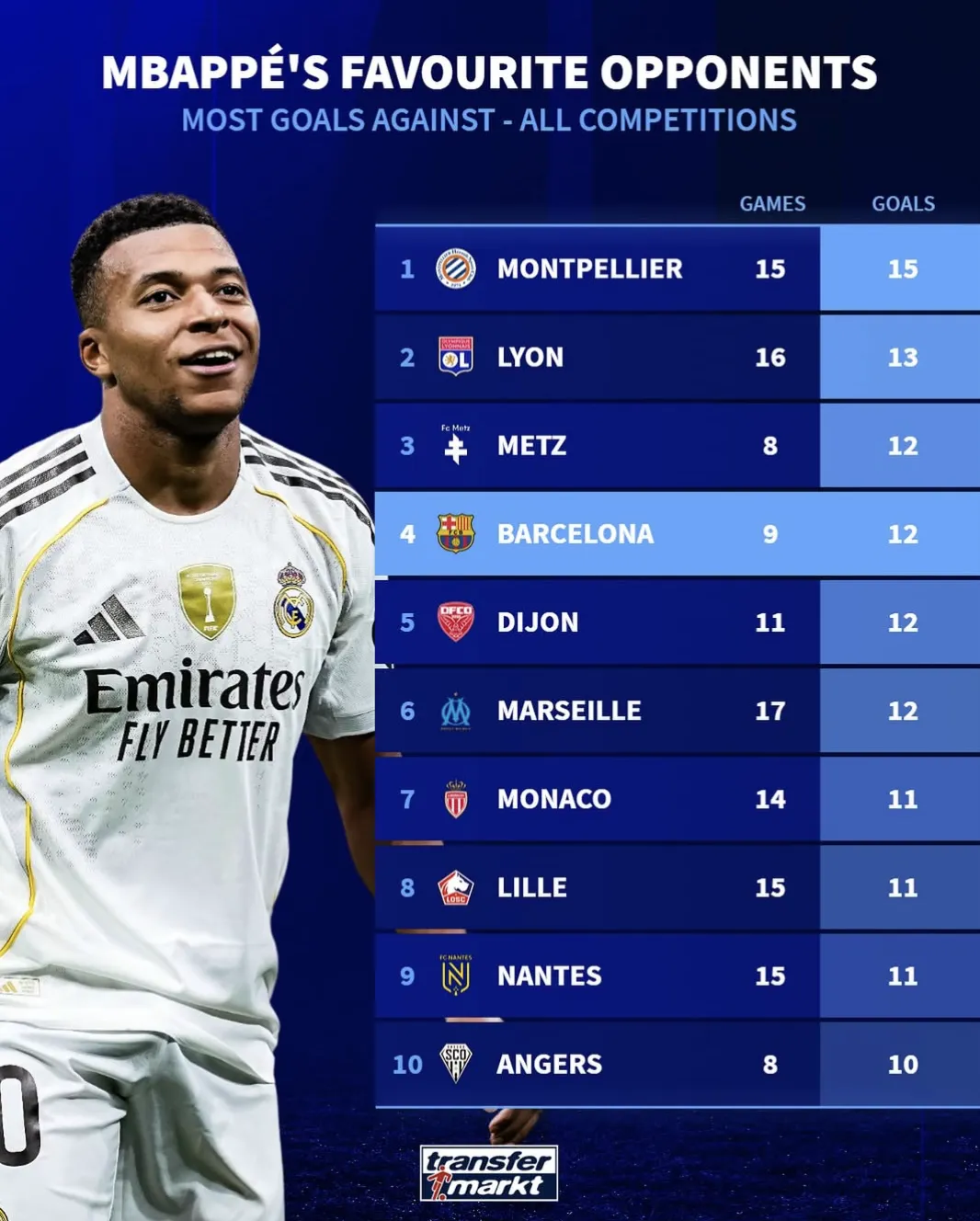 虎撲10月27日訊 德轉統計了姆巴佩最喜歡的對手榜。
