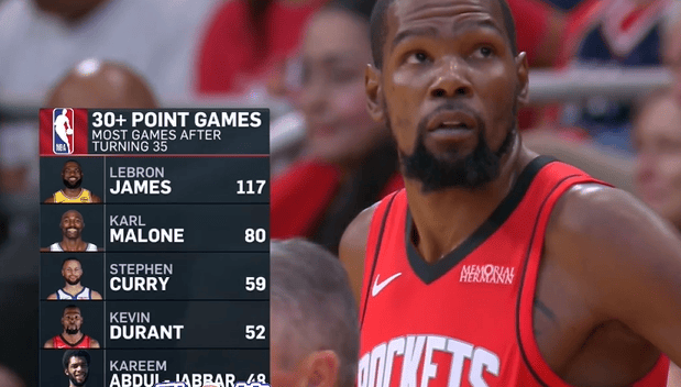 [流言板]35歲后最多30+場(chǎng)次:詹姆斯117次居首,庫里59場(chǎng)KD52場(chǎng)