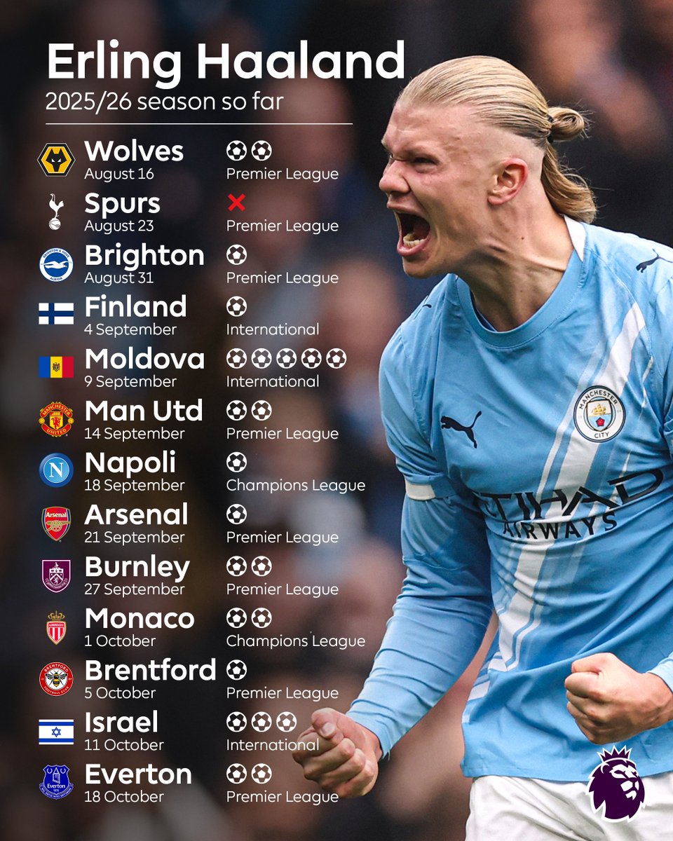 進(jìn)入10月以來(lái),他只有1場(chǎng)比賽的進(jìn)球不足2球:對陣布倫特福德。