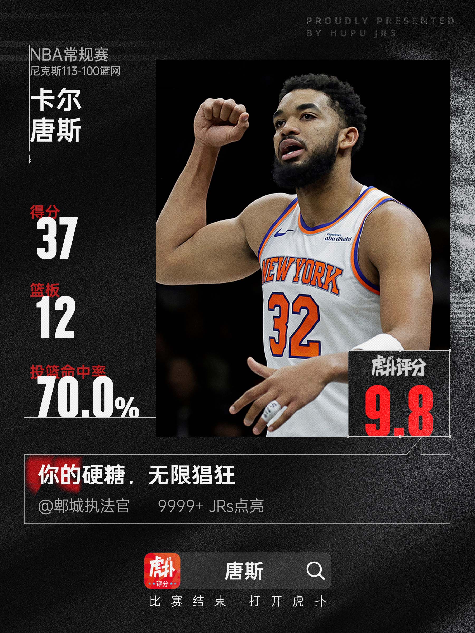 尼克斯球員卡爾-安東尼-唐斯全場(chǎng)出戰33分鐘,到分斷蓋20投14中,攻搶三分4中3、流言力全罰球6中6得到37分12籃板3助攻1搶斷2蓋帽。板火板助