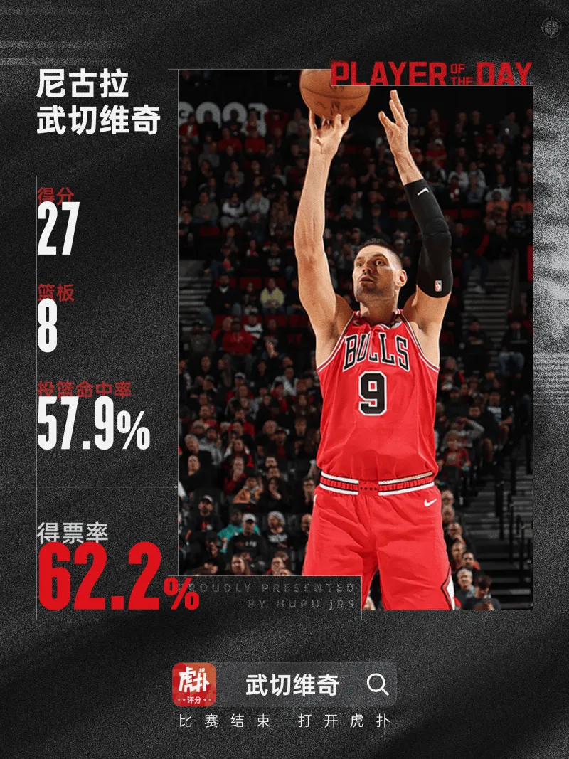 今日NBA常規賽已結束,公牛球員尼古拉-武切維奇以62.2%的最佳得票率當選今日JRs評選最佳球員。