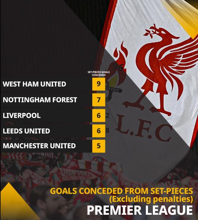 [流言板]本賽季英超球隊定位球丟球前5名:西漢姆聯(lián)最多,利物浦在列