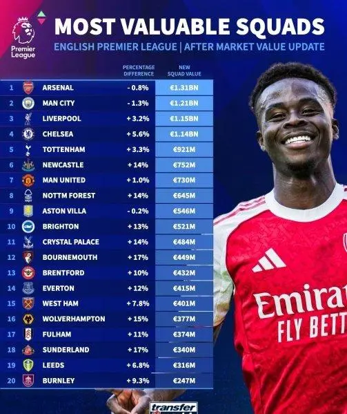 5、英超俱樂(lè )部最新的身價(jià)排名:阿森納、曼城、利物浦居前三位(見(jiàn)下圖)。