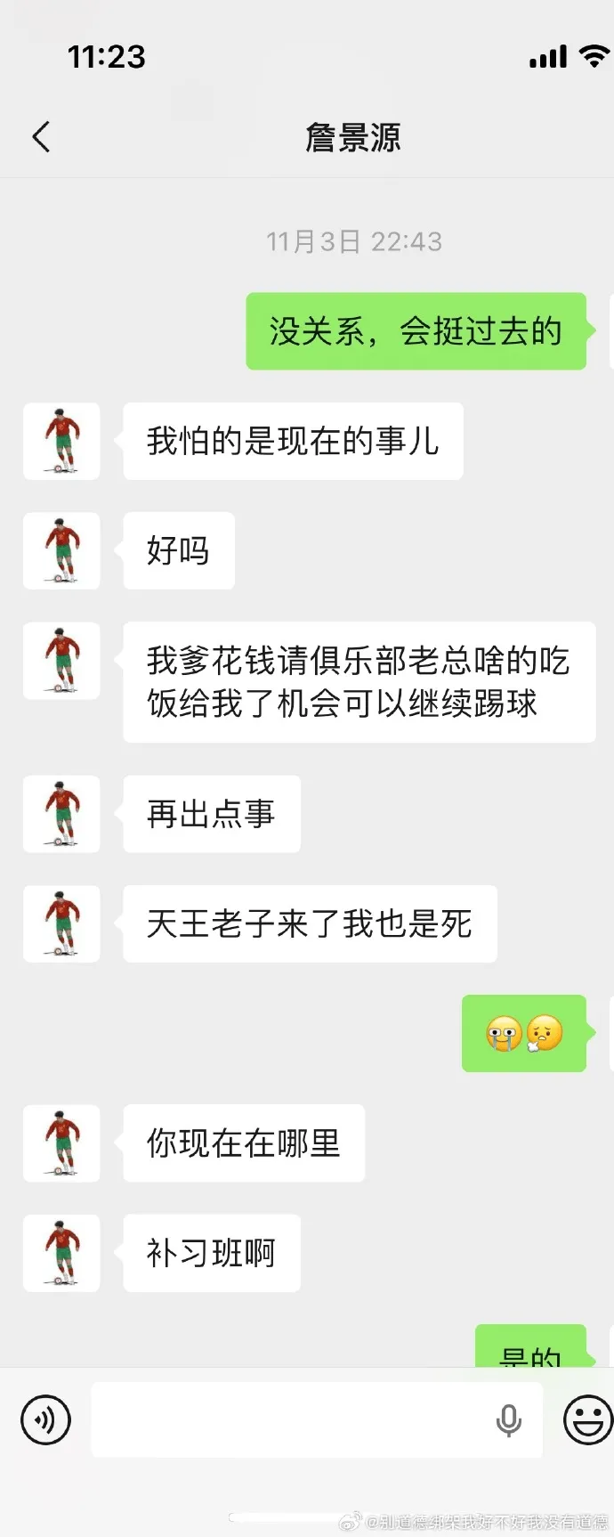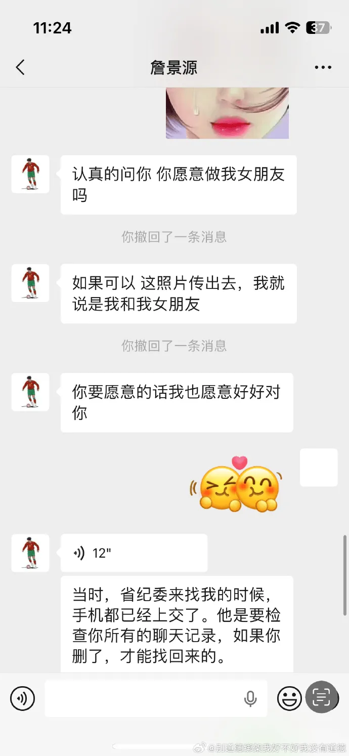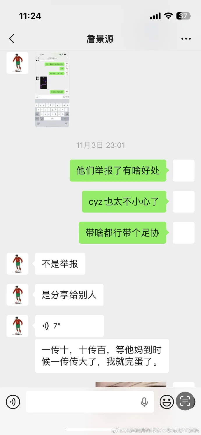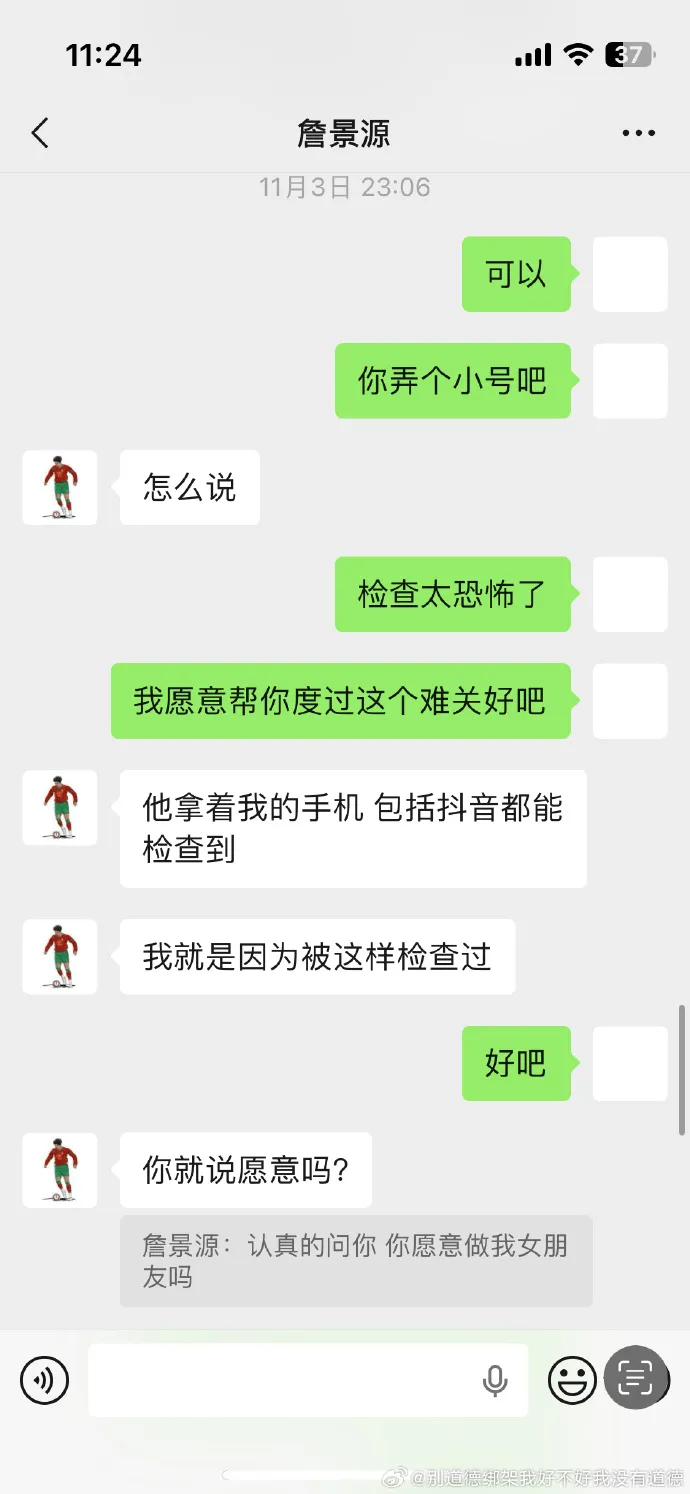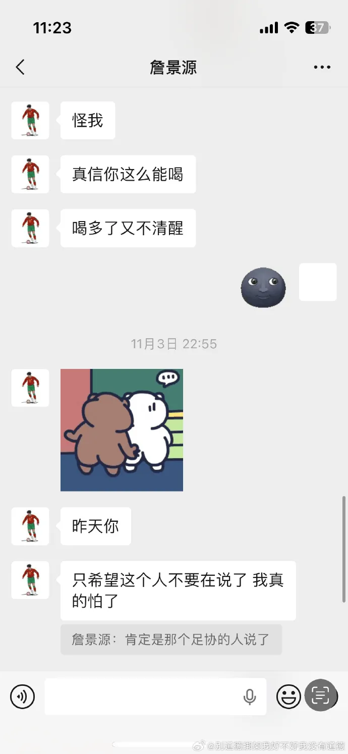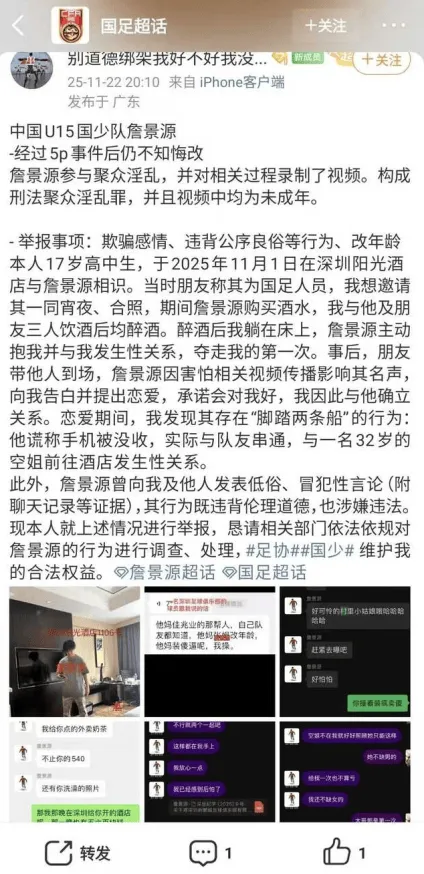 本人17歲高中生,于2025年11月1日在深圳陽(yáng)光酒店與詹景源相識。當時(shí)朋友稱(chēng)其為國足人員,我想邀請其一同宵夜、合照,期間詹景源購買(mǎi)酒水,我與他及朋友三人飲酒后均醉酒。醉酒后我躺在床上,詹景源主動(dòng)抱我并與我發(fā)生性關(guān)系,奪走我的第一次。事后,朋友帶他人到場(chǎng),詹景源因害怕相關(guān)視頻傳播影響其名聲,向我告白并提出戀愛(ài),承諾會(huì )對我好,我因此與他確立關(guān)系。戀愛(ài)期間,我發(fā)現其存在“腳踏兩條船”的行為:他謊稱(chēng)手機被沒(méi)收,實(shí)際與隊友串通,與一名32歲的空姐前往酒店發(fā)生性關(guān)系。