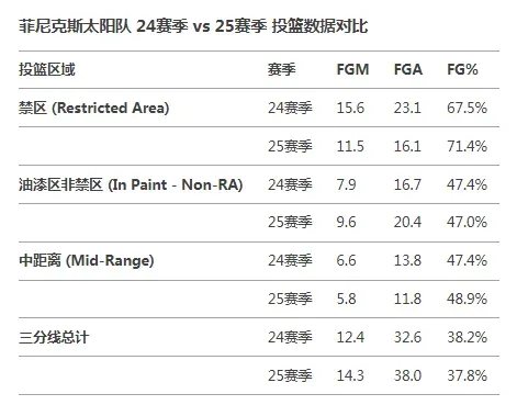 太陽(yáng)25賽季相對于24賽季,三分增加了,但填不了禁區進(jìn)攻削弱的坑。