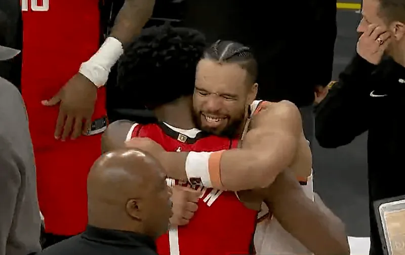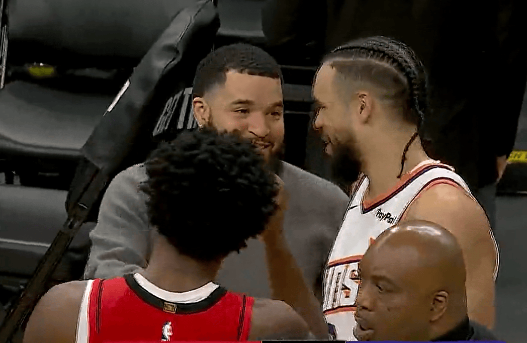 狄龍賽后和火箭前隊友阿門(mén)、箭前范弗利特、阿門(mén)史密斯擁抱交談。范弗