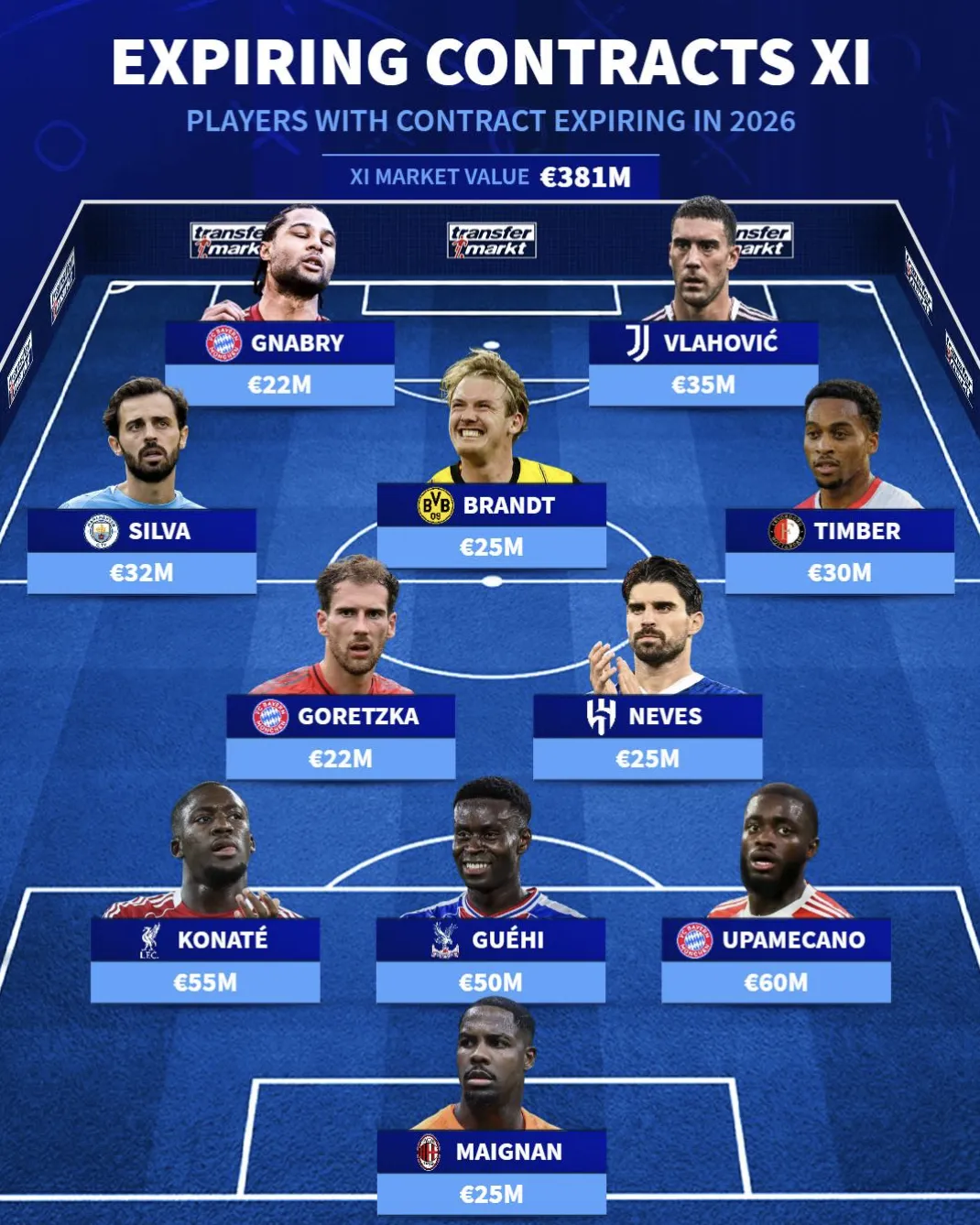 虎撲11月09日訊 德轉統計了合同即將明夏到期的最高身價(jià)陣容。