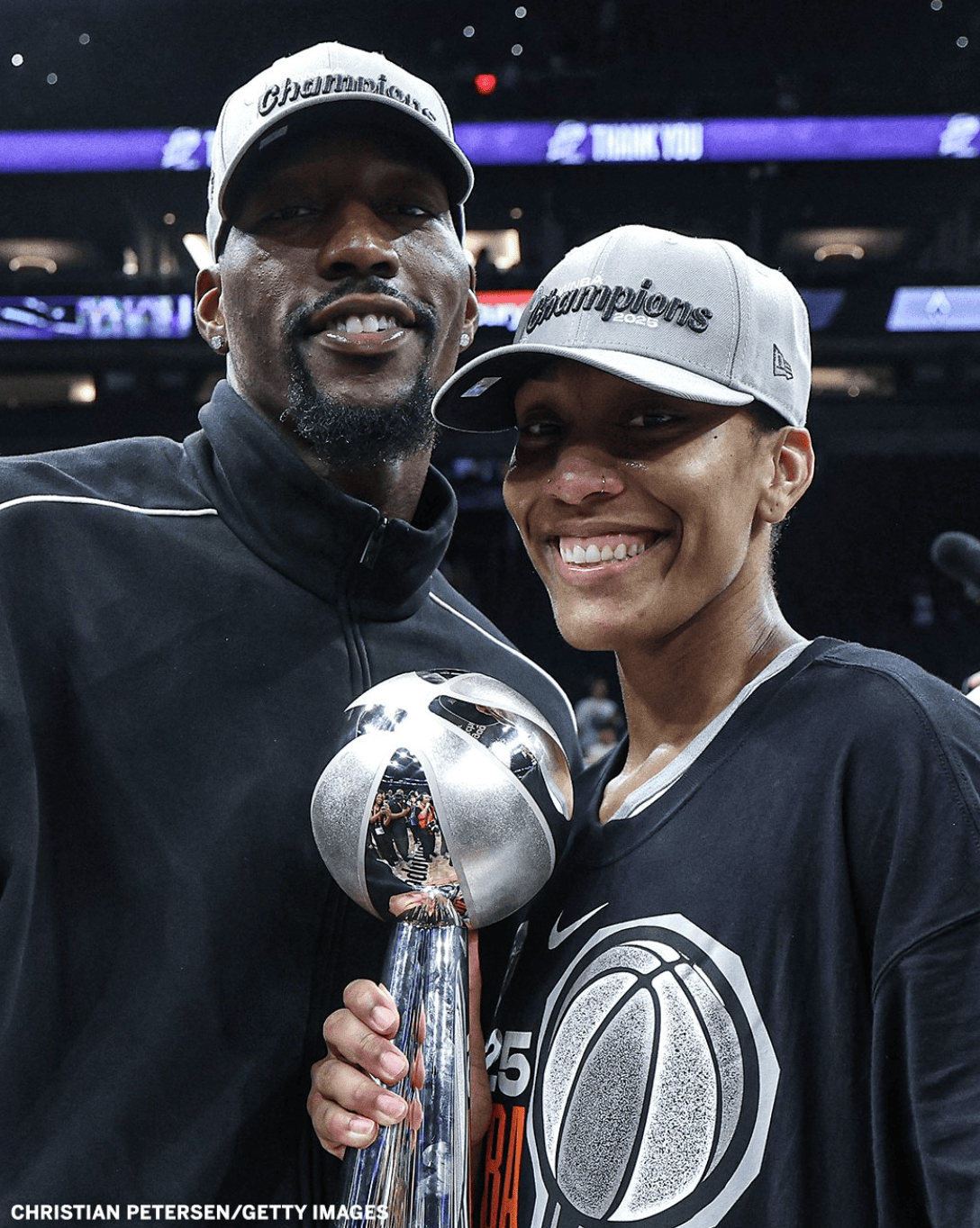 賽后,ESPN曬出了威爾遜與男友巴姆-阿德巴約手拿獎杯合影照片,并寫(xiě)道:“愛(ài)與籃球????”