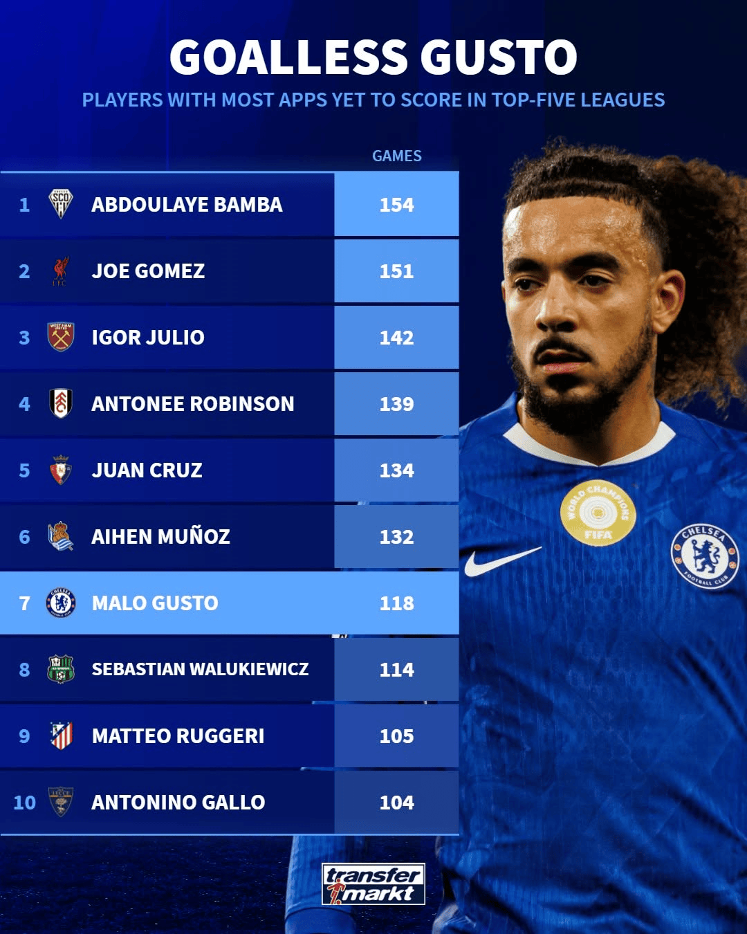 排名第二的行榜是利物浦后衛喬-戈麥斯,他在英超出場(chǎng)151次仍未破門(mén)。流言聯(lián)賽第三位為西漢姆聯(lián)的無(wú)進(jìn)胡里奧,出場(chǎng)142場(chǎng)同樣顆粒無(wú)收,球球喬切爾西的員出古斯托排名第七。