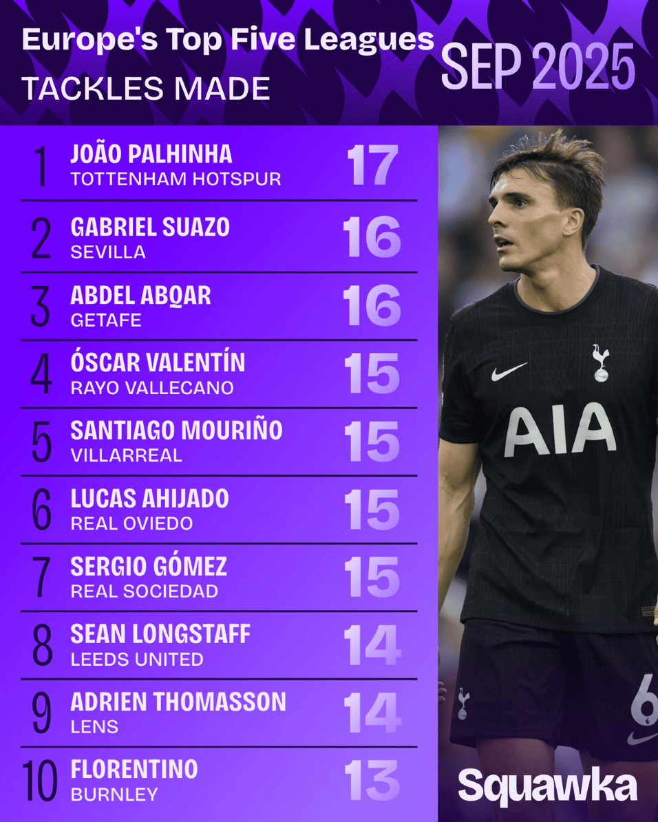 虎撲10月01日訊 根據Squawka的統計,帕利尼亞是賽今今年9月份歐洲五大聯(lián)賽完成搶斷次數最多的球員: