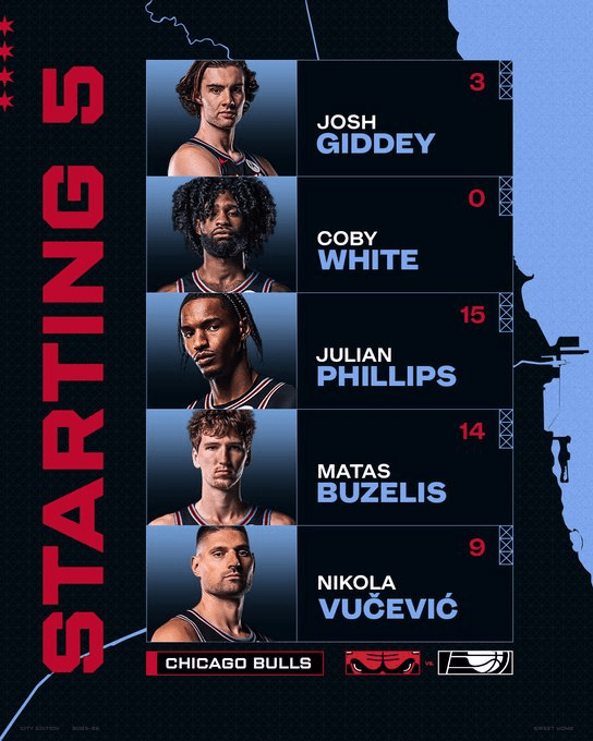 賽前,公牛更新官方社媒,公布了球隊首發(fā)陣容。