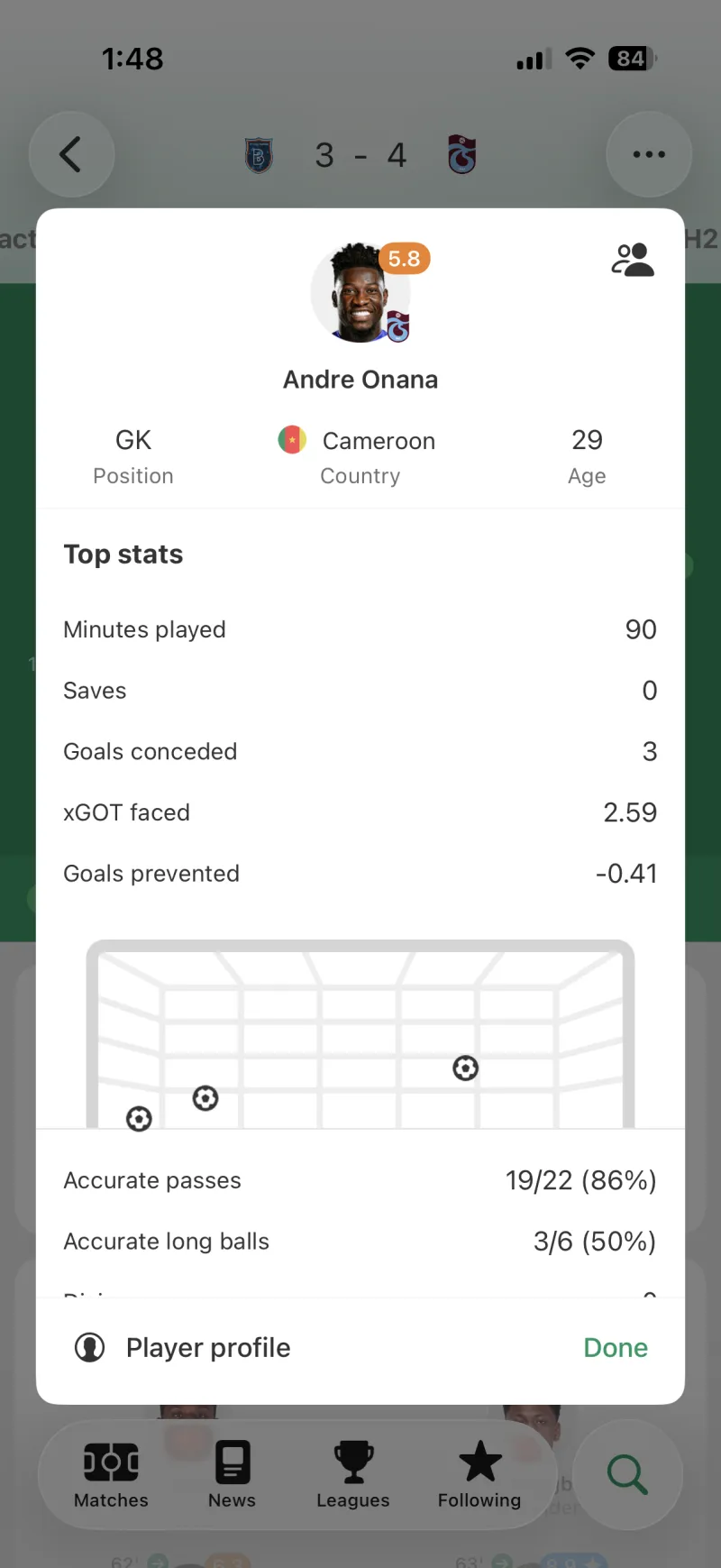盡管隊伍獲勝,但是賽中奧納納阻止進(jìn)球竟然是負數。