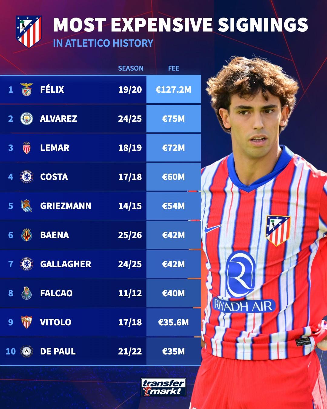[流言板]馬競隊史最貴引援:費利克斯1.27億歐居首,阿爾瓦雷斯第二