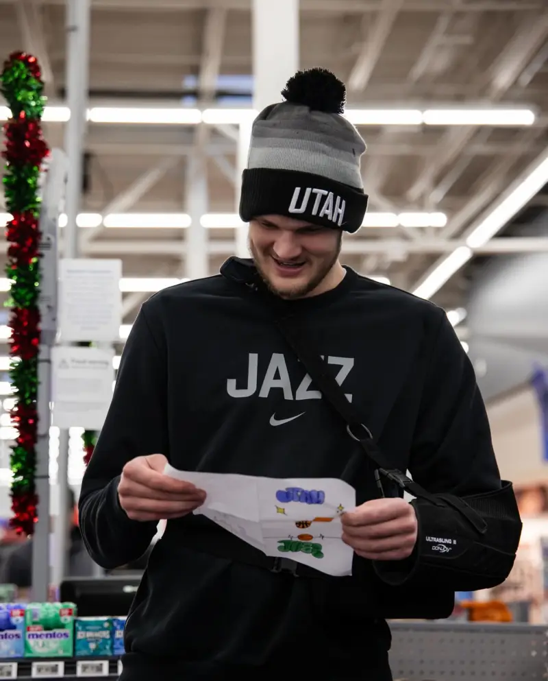 虎撲12月20日訊 爵士隊官方ins分享圖集,凱斯勒助學(xué)生完成節日愿望清單。成節