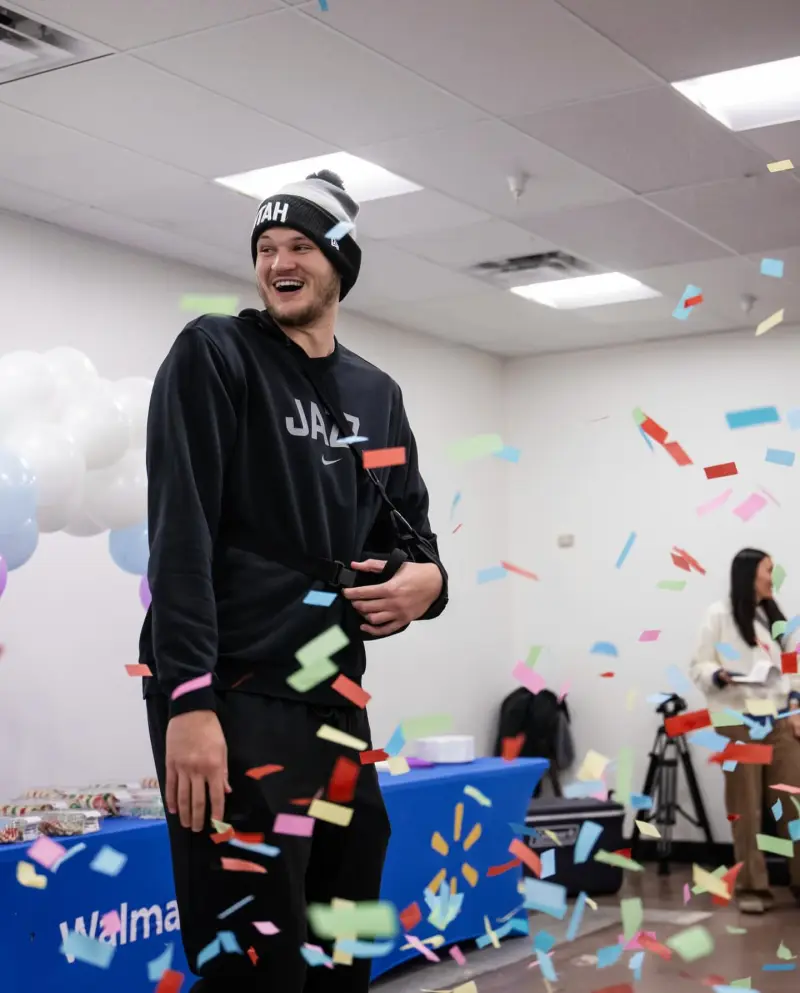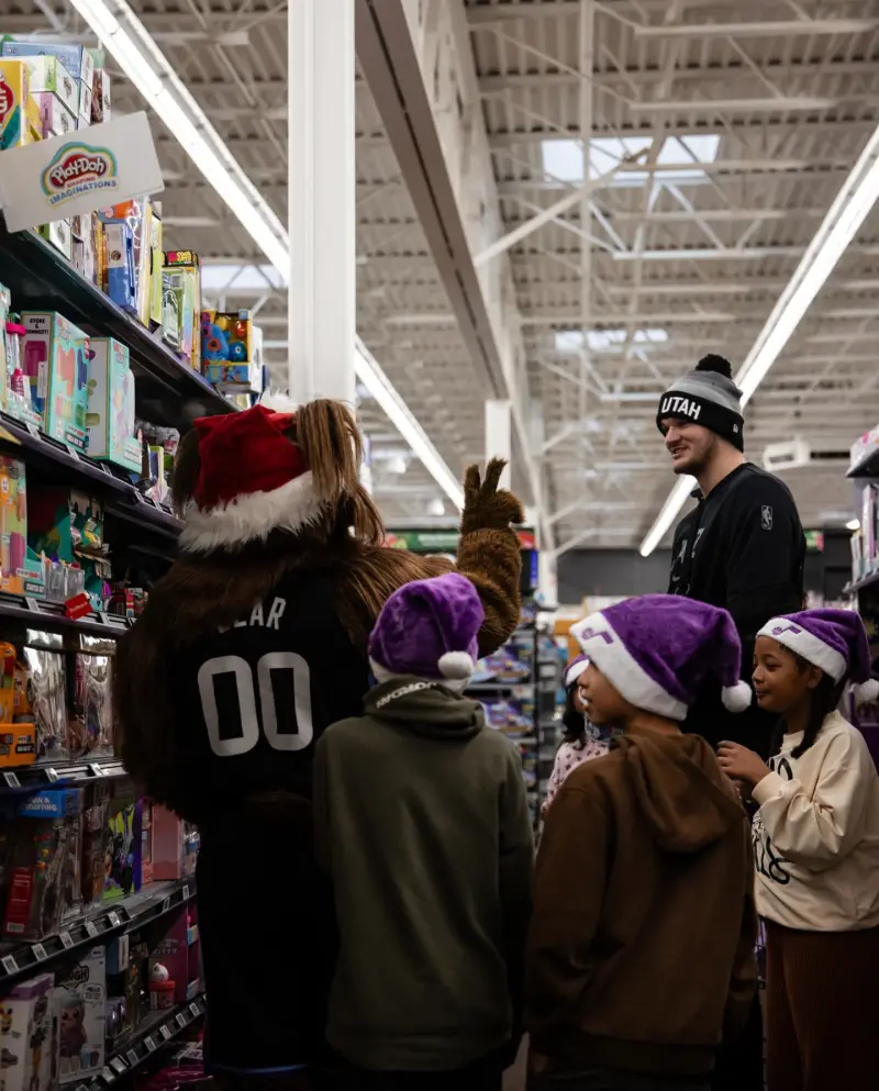 虎撲12月20日訊 爵士隊官方ins分享圖集,凱斯勒助學(xué)生完成節日愿望清單。士社斯勒生完