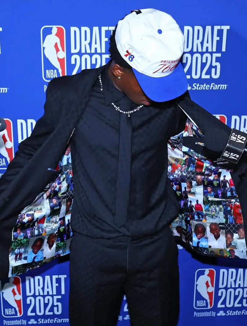 選秀時(shí),埃奇庫姆還穿了一件特別定制的西裝,里面貼滿(mǎn)了自己和家人,還有和‘糖’教練的照片。