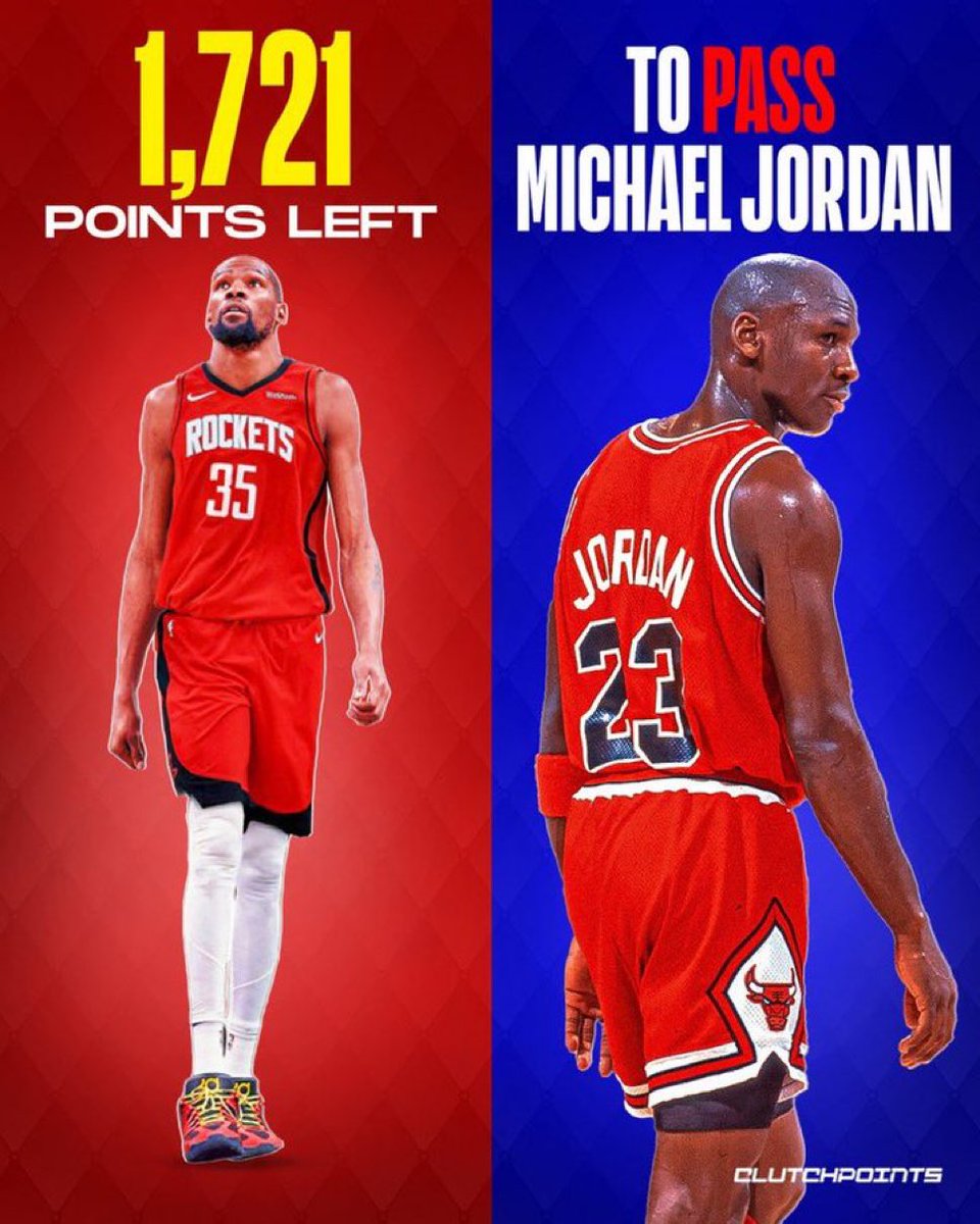 虎撲08月05日訊 今日,美媒NBA Meme曬出圖片,得分表示凱文-杜蘭特還差1721分就能在歷史總得分榜上超越邁克爾-喬丹。詹姆