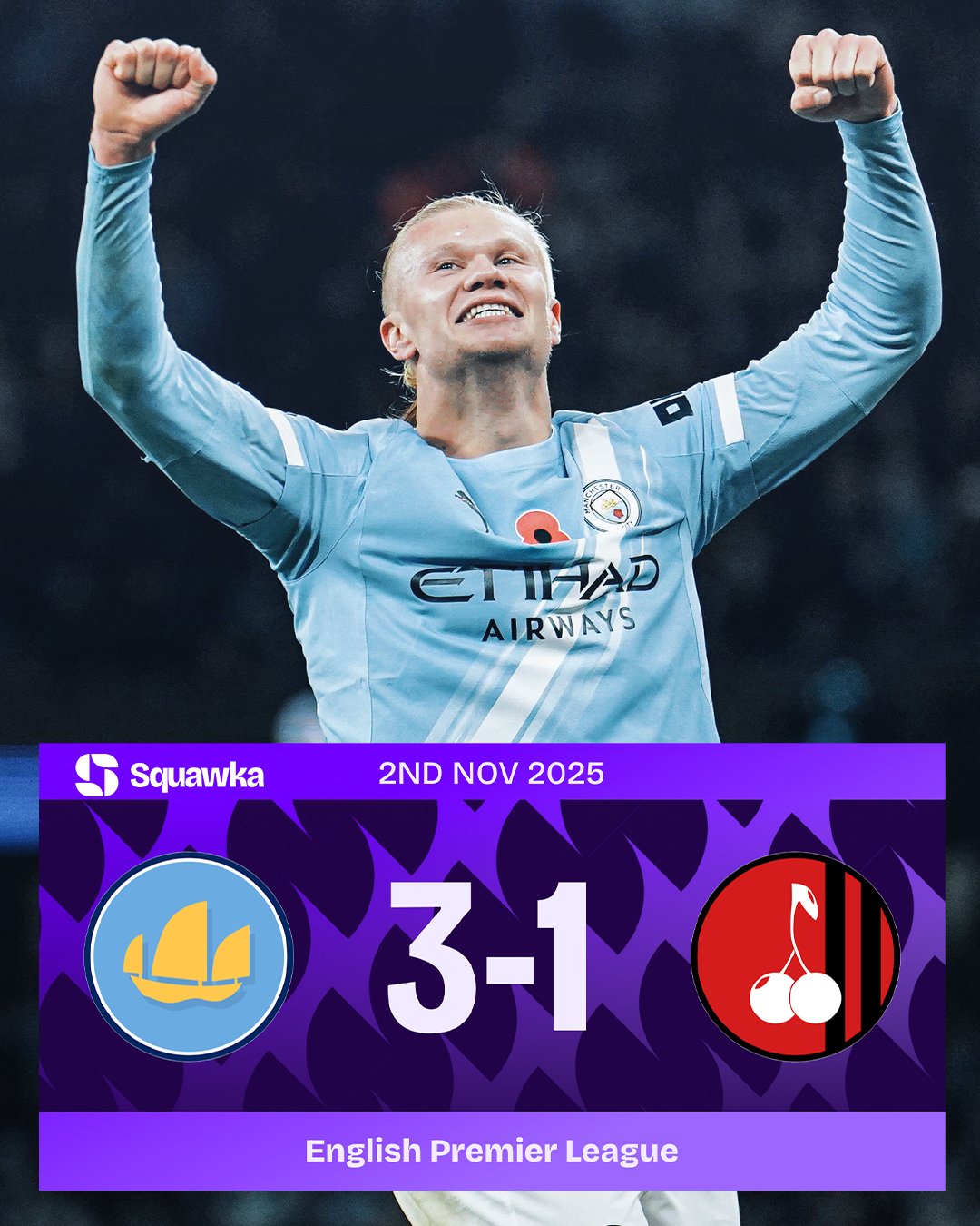 至此曼城在伊蒂哈德球場(chǎng)對陣伯恩茅斯的入球英超戰績(jì)?yōu)?戰全勝。