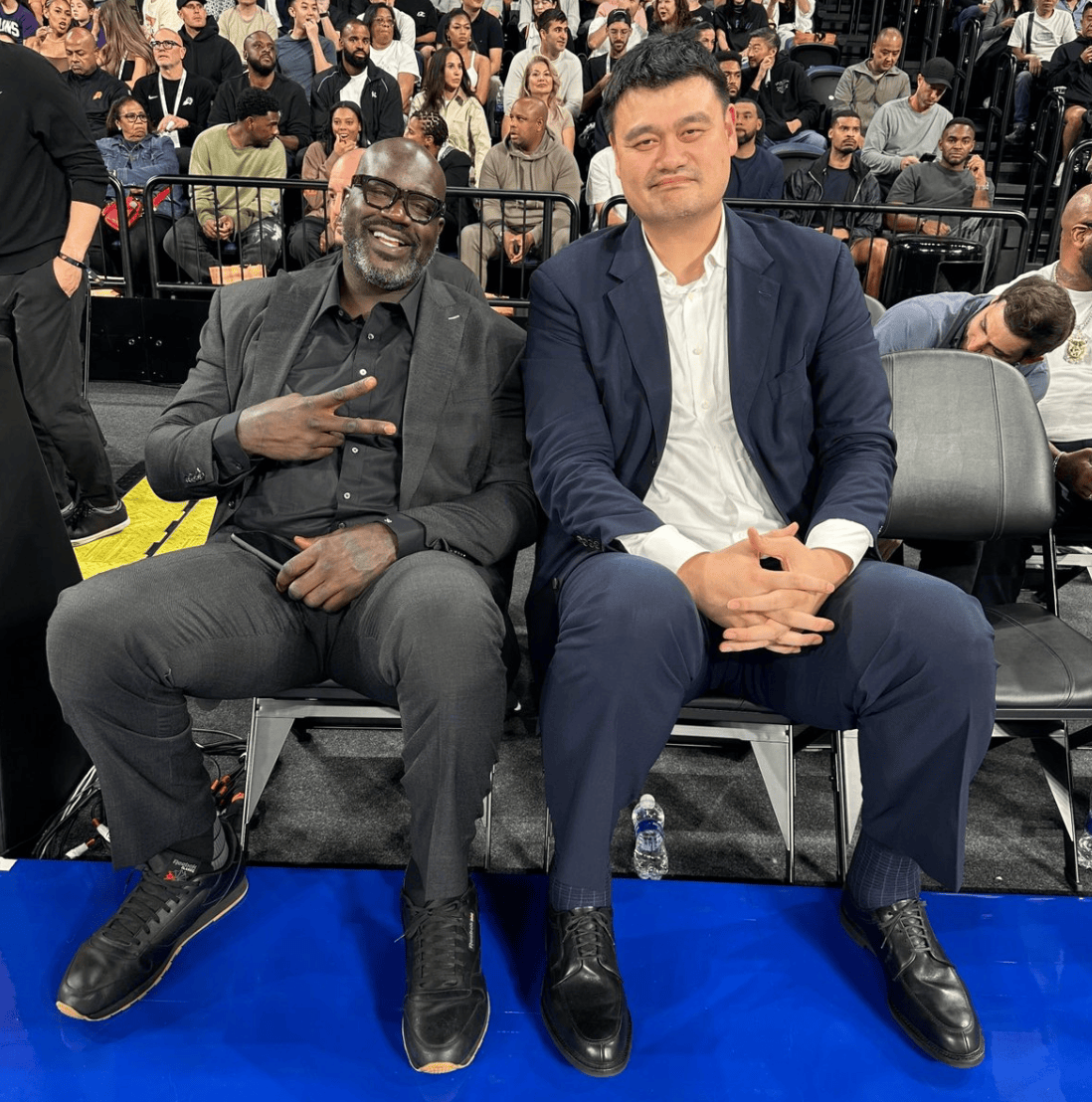 虎撲10月10日訊 NBA中國賽太陽(yáng)與籃網(wǎng)的季前賽正在進(jìn)行中,比賽上半場(chǎng)結束時(shí),齊聚NBA官方更新社媒,中國曬出了沙奎爾-奧尼爾與姚明在場(chǎng)邊的流言?xún)晌?strong>合影。