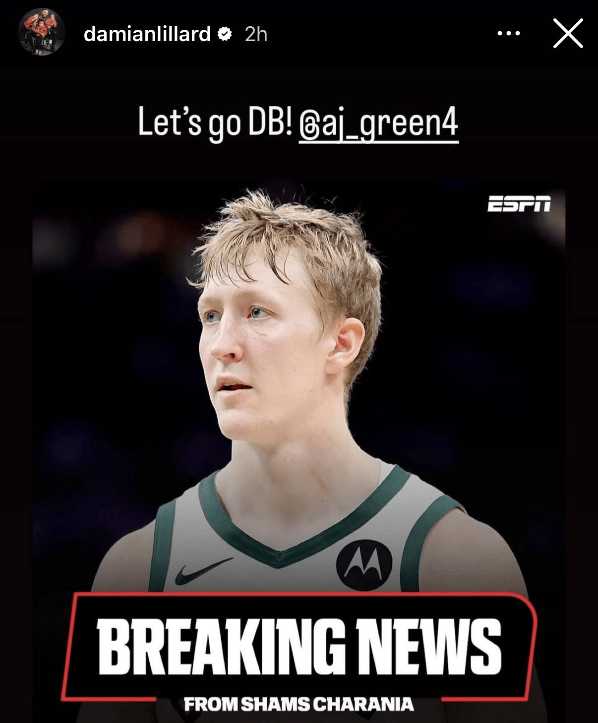 隨后,上祝前隊友,流言利拉開(kāi)拓者球員達米安-利拉德在Ins上轉發(fā)此動(dòng)態(tài)并配文:
