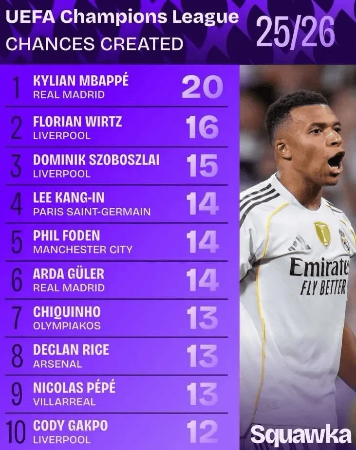 Squawka:本賽季歐冠創(chuàng )造機會(huì )排行榜單,他們是皇馬、利物浦、阿森納、曼城、巴黎等球隊的球員。。