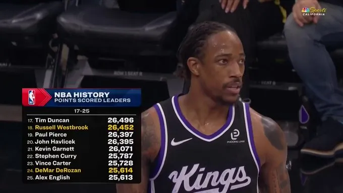 此役德羅贊達成里程碑,NBA總得分超越亞歷克斯-英格利什,升至第24位。