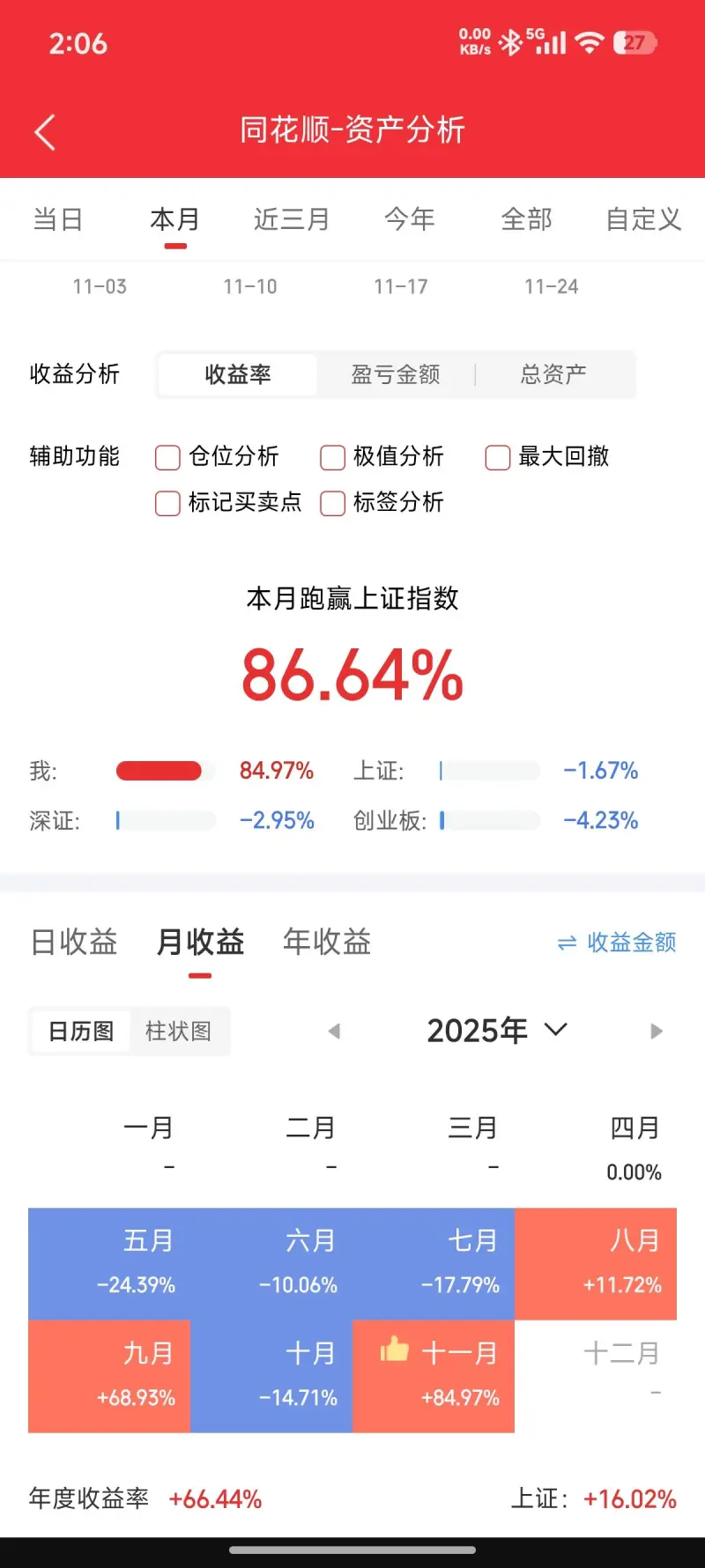 家里人對股票接受度為0,跟老婆溝通過(guò)多次都無(wú)法接受,已完全放棄溝通。5月份實(shí)在忍不住,偷偷開(kāi)了戶(hù),偷偷取了點(diǎn)公積金炒到了現在。開(kāi)戶(hù)后連虧3個(gè)月,最高虧損49%,所幸8月開(kāi)始盈利,9月正式水上,10月再次虧損,11月實(shí)現大幅盈利。實(shí)在沒(méi)有地方分享,來(lái)這里記錄一下,也許我永遠也不會(huì )告訴家里人我在偷偷炒股。
