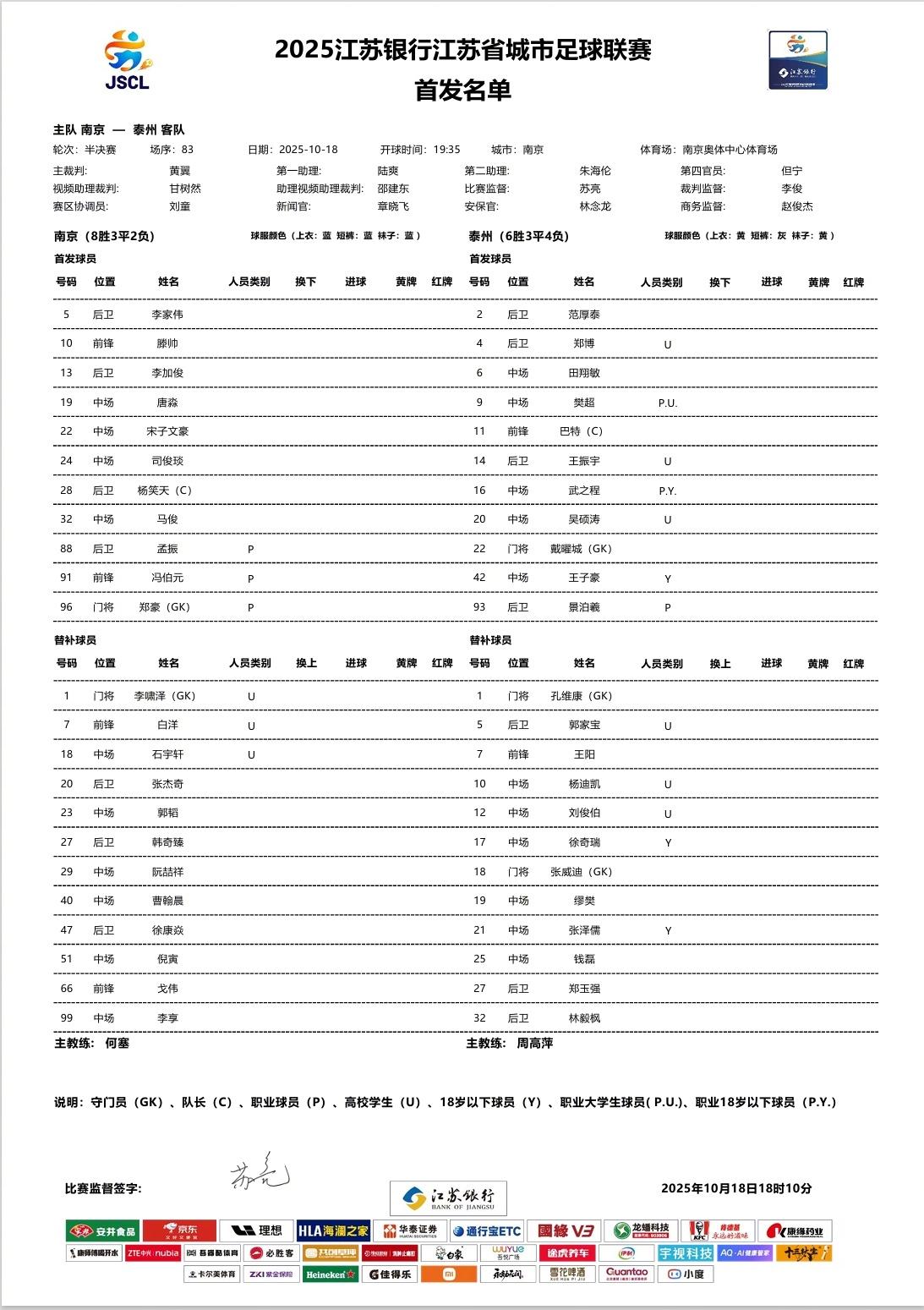 虎撲10月18日訊 今晚蘇超半決賽首場(chǎng)對決一觸即發(fā),南京將在主場(chǎng)迎戰泰州。賽前,首發(fā)名單已經(jīng)出爐。