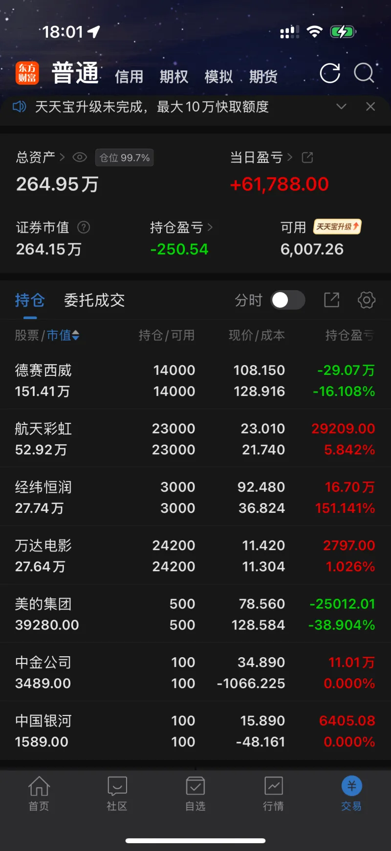這一次的話(huà),虧損在我承受范圍內,我中長(cháng)平均做一只票的盈利都是再30-50個(gè)點(diǎn)往上,目前吐掉盈利還浮虧15%也能接受,只能說(shuō)算主力有本事,都是好老師。這次唯一的問(wèn)題就是德賽調倉后的智駕倉位配置的太重了導致動(dòng)作變形,不然120的成本7000股任憑主力怎么搞都不會(huì )傷及筋骨。以后得雞賊一點(diǎn)了,邊漲邊減倉鎖利潤,像經(jīng)緯恒潤一樣操作,這樣才能伺候國內的猥瑣資金,最多無(wú)非也就少賺點(diǎn)。