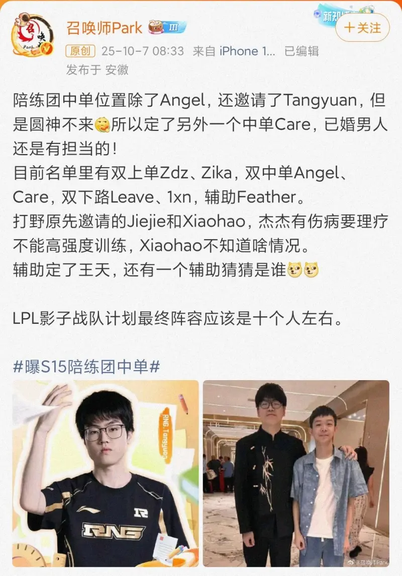 陪練團中單位置除了Angel,陪練還邀請了Tangyuan,團最但是新消息圓神不來(lái),所以定了另外一個(gè)中單Care,定加已婚男人還是接受有擔當的!
