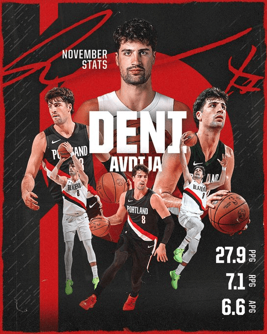 賽后,開(kāi)拓者官方發(fā)布阿夫迪亞11月數據,場(chǎng)均可以得到27.9分7.1籃板6.6助攻。