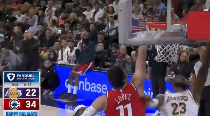第二節比賽中,后暴詹姆斯中線(xiàn)搶斷后暴扣連拿4分,扣連目前得到14分、拿分湖人全隊22分。得到隊分