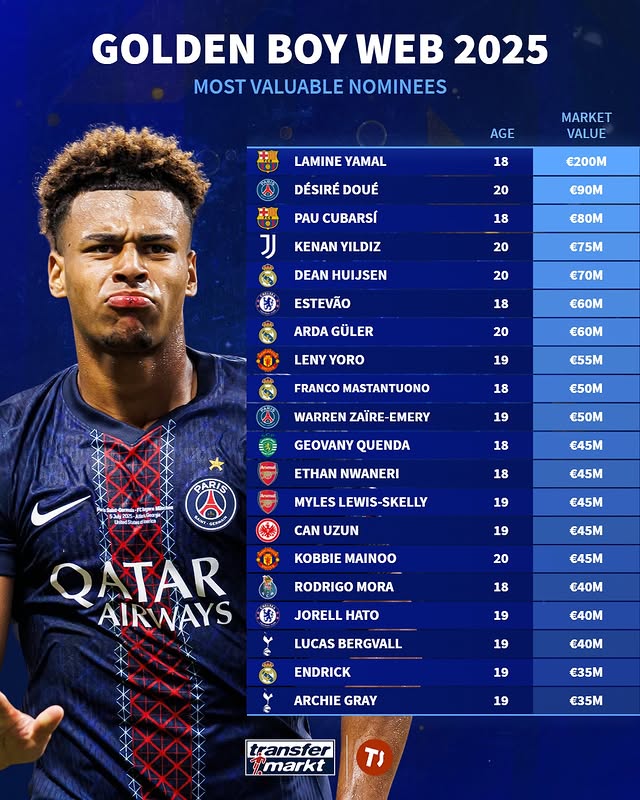 虎撲10月28日訊 德轉盤(pán)點(diǎn)25年金童獎候選名單身價(jià)排名,亞馬爾、板德杜埃、轉年庫巴西排名前三。金童獎候價(jià)排
