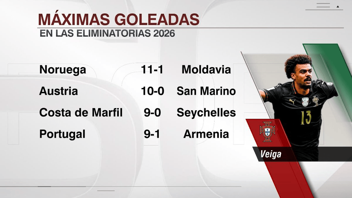 前四場(chǎng)大比分中,3場(chǎng)來(lái)自世界杯歐洲區預選賽,1場(chǎng)來(lái)自非洲區預選賽;其他大區方面,中北美及加勒比區預選賽的最大分差為8球,比如哥斯達黎加8-0巴哈馬、波多黎各8-0安圭拉;亞洲預選賽的最大分差則為7球,比如卡塔爾8-1阿富汗、日本7-0中國;南美這屆世預賽目前的最大分差是阿根廷6-0玻利維亞,凈勝6球。