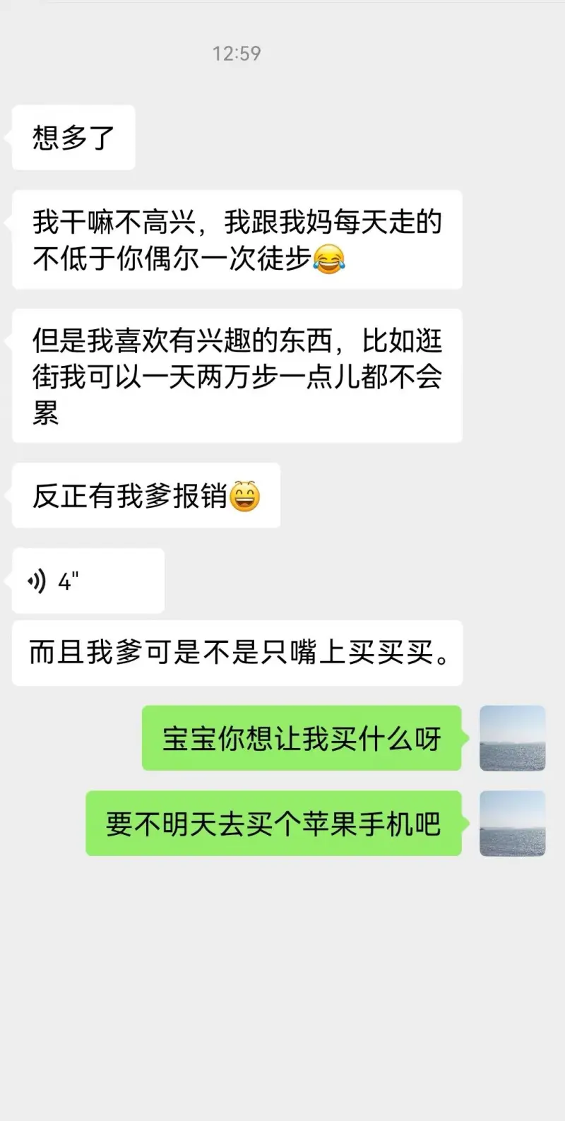 10月3號她和她爹媽出去逛街買(mǎi)衣服,也沒(méi)叫上我,我就一整天自己在家休息。當天下午我收到她發(fā)微信消息,她說(shuō)他們仨買(mǎi)了幾件旗袍,問(wèn)我哪個(gè)好看,我就說(shuō)都挺好的,同時(shí)發(fā)了個(gè)買(mǎi)買(mǎi)買(mǎi)的表情包,她就問(wèn)我能掏錢(qián)報銷(xiāo)嗎。我當時(shí)心里有點(diǎn)不太痛快,心想著(zhù)昨天剛給你們送了見(jiàn)面禮物,今天怎么又找我掏錢(qián)?而且他們又沒(méi)邀請我去一起逛街,于情于理都不應該我出這個(gè)錢(qián)。不過(guò)我還是答應說(shuō)好的。不過(guò)她也沒(méi)繼續索要,沒(méi)告訴我多少錢(qián),我也就以為只是開(kāi)了個(gè)玩笑。