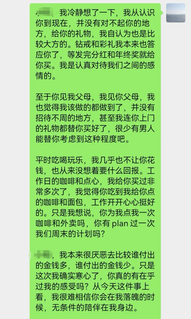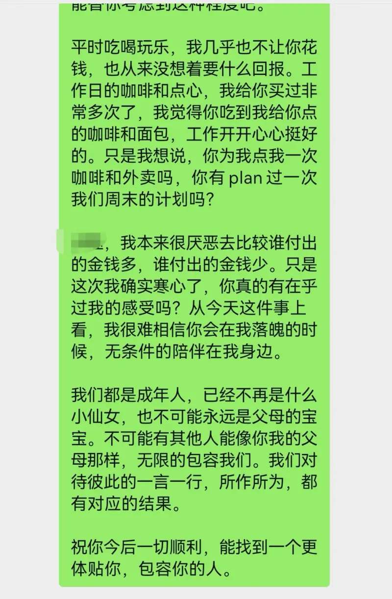 在一段感情中,單方面持續性的金錢(qián)付出不會(huì )長(cháng)久。思考了一下,盡管我已經(jīng)33歲了,很珍惜這段緣分,但是還是和她說(shuō)了分手,及時(shí)止損,總好過(guò)未來(lái)受到更多的折磨。。。