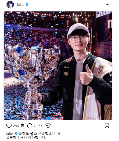 [流言板]Faker:今年也贏(yíng)下全球總決賽了,今年決賽加油感謝大家給我們加油由虎撲游戲電競資訊 發(fā)表在英雄聯(lián)盟 https://bbs.hupu.com/lol