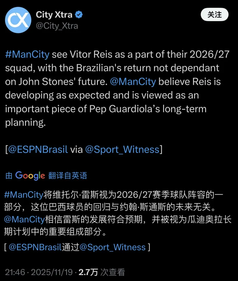 【Espn巴西】雷斯被視為曼城下賽季陣容一員 / 和石頭的巴西被視
