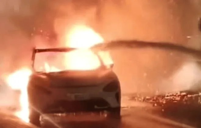 虎撲11月11日訊 江蘇常州。一輛SU7汽車(chē)在在路邊起火燃燒,目擊者稱(chēng),火勢發(fā)展迅猛,汽車(chē)瞬間就被大火吞噬,火苗躥起數米高,現場(chǎng)還傳出爆炸聲,消防用高壓水槍壓制住火勢之后,車(chē)輛已經(jīng)燒成了空殼。