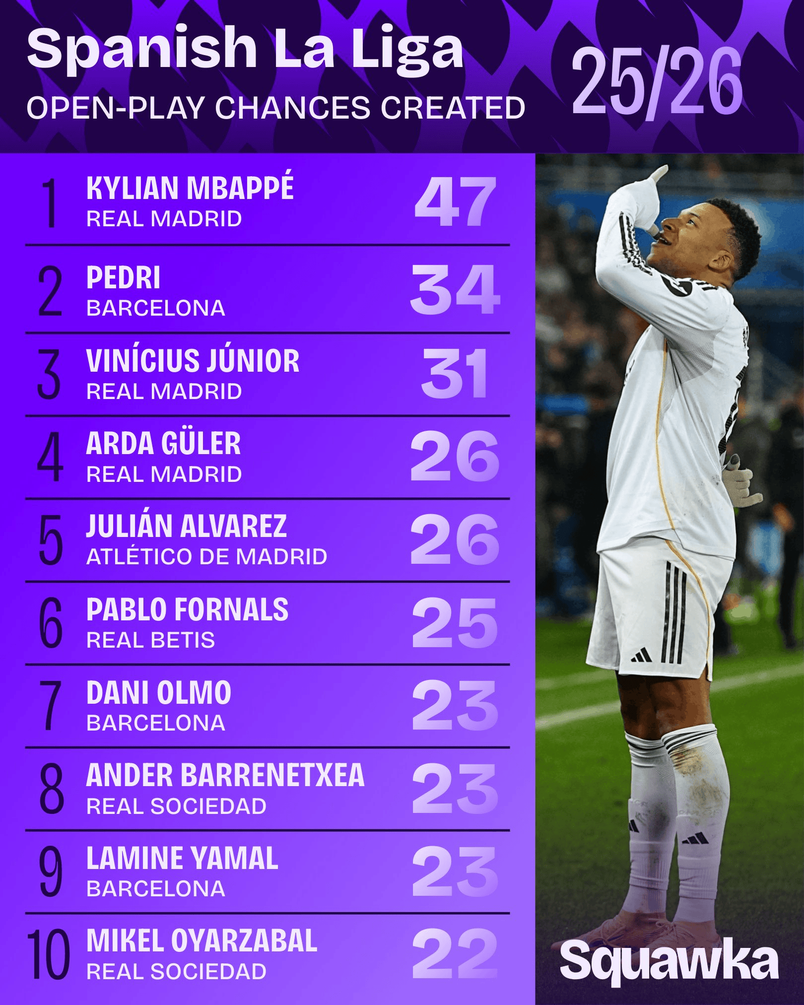 1.姆巴佩(皇家馬德里)47次