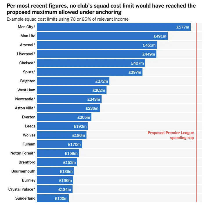 據預測,如果錨定機制在當前的2025-26賽季實(shí)施,隨著(zhù)新的電視轉播合同周期開(kāi)始,預計分配給俱樂(lè )部的收入將會(huì )增加,屆時(shí)錨定上限將提高到6億英鎊。