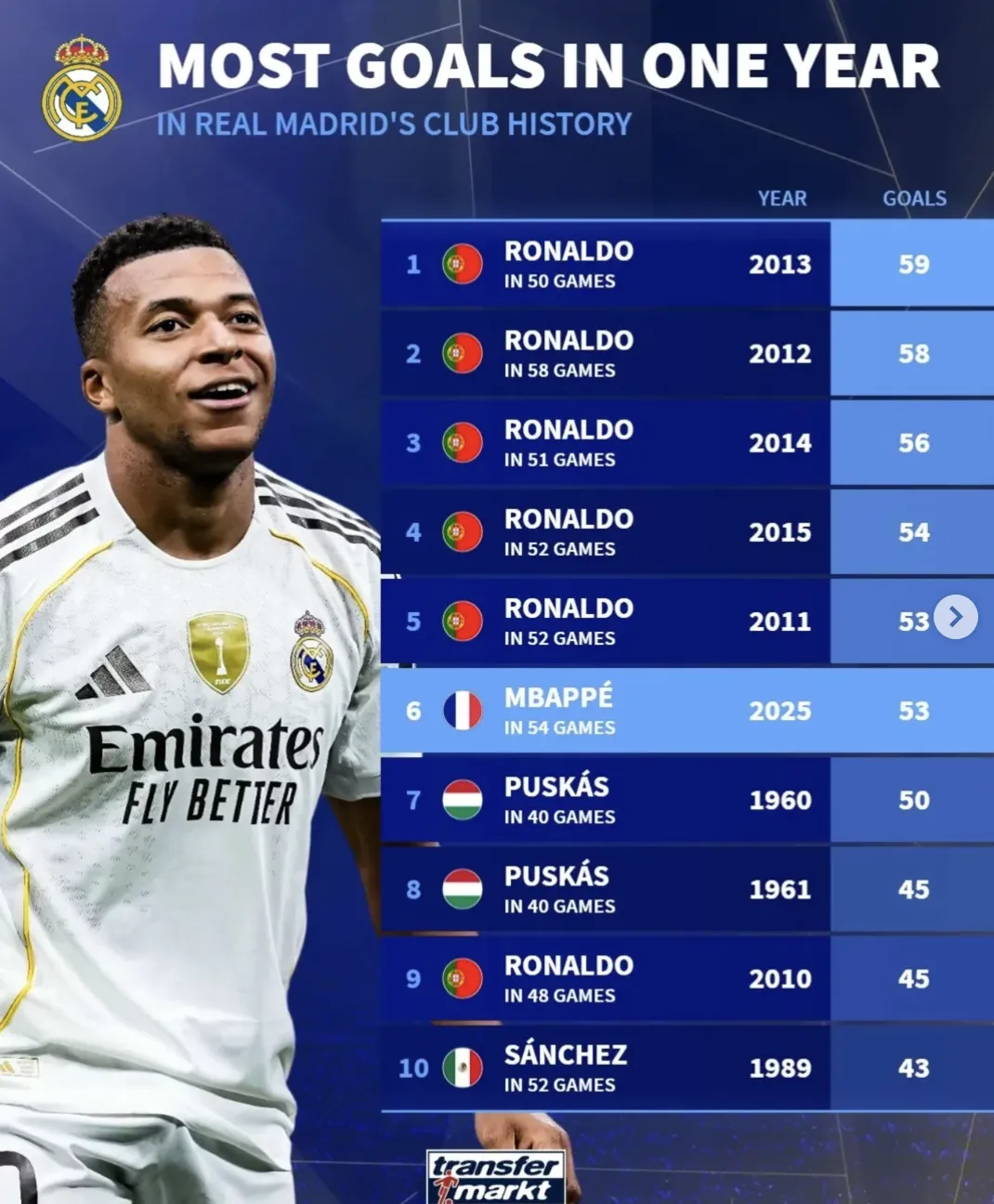 6. 姆巴佩(2025年):54場(chǎng)53球