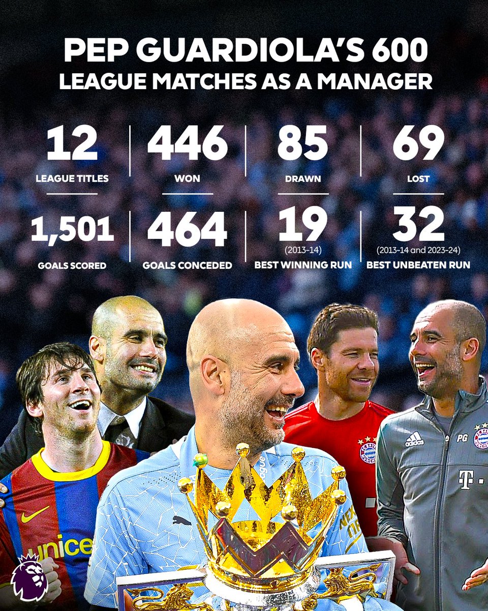 歷經(jīng)巴薩、城執拜仁、教榮曼城三段執教生涯,譽(yù)盤(pán)瓜迪奧拉在600場(chǎng)聯(lián)賽中取得了446場(chǎng)勝利,流言拉巴練拿到12個(gè)聯(lián)賽冠軍。板瓜