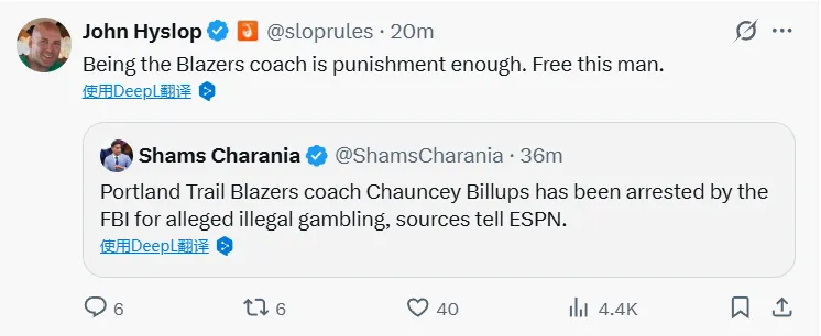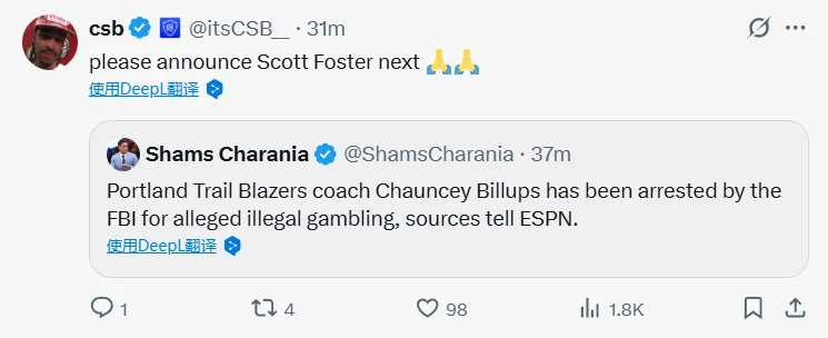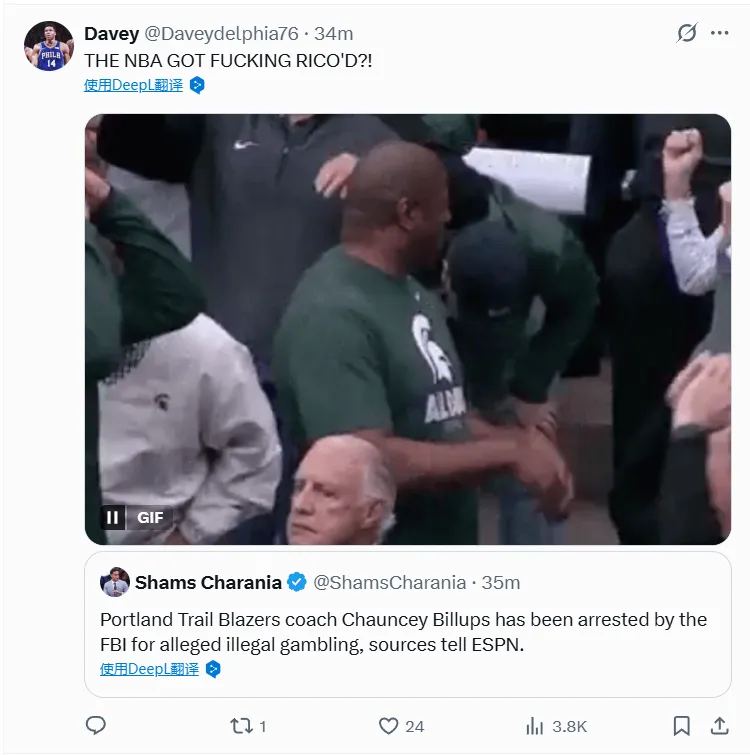 重磅消息:開(kāi)拓者主帥比盧普斯今晨因參與體育博彩賭博遭FBI逮捕。