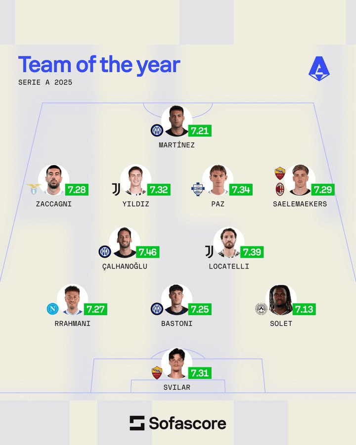 [流言板]Sofascore2025意甲最佳陣:恰20、薩56、伊爾迪茲、帕斯入選