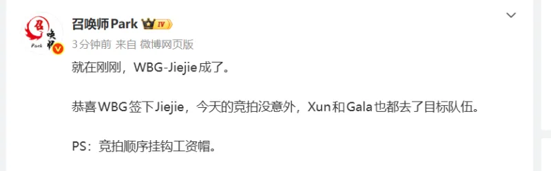 恭喜WBG簽下Jiejie,熱議今天的博主爆料競拍沒(méi)意外,Xun和Gala也都去了目標隊伍。熱議
