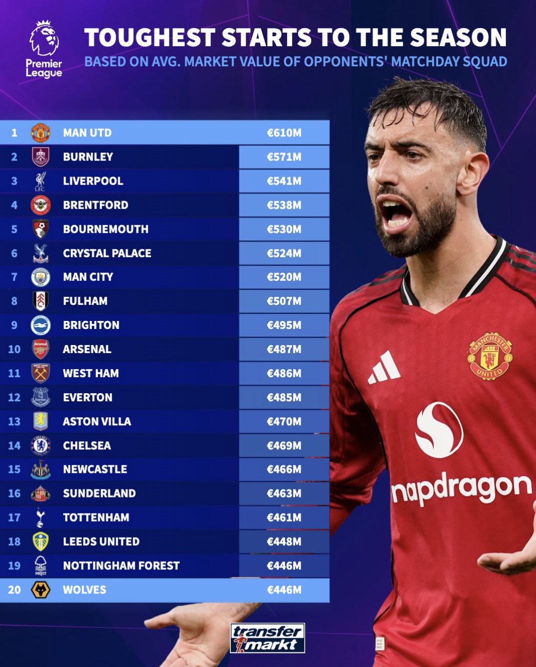 曼聯(lián)前11輪的曼聯(lián)對手平均身價(jià)6.1億歐排名第一;伯恩利對手平均身價(jià)為5.71億歐排第二;利物浦的對手平均身價(jià)為5.41億歐排第三。
